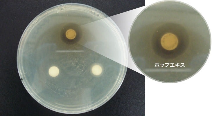 A群溶血性レンサ球菌を寒天培地に植え付けた後に123種のハーブエキスを各々ろ紙に添加しました。37℃、5%CO2の条件下で数日培養した後に阻止円(A群溶血性レンサ球菌が生育できない領域)の有無と大きさを確認しました。その結果、「ホップ」を含む11種のハーブエキスについて大きな阻止円を認め、A群溶血性レンサ球菌に対する抗菌力(菌の増殖を抑制する力)が確認できました。