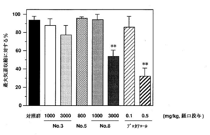 被験物質No.3は最大投与量の3000mg/kgで若干の抑制作用を示したものの有意ではなかった。No.8は同3000mg/kgで抗原誘発による気管支収縮を有意に抑制した。対照薬のプロカテロールは本モデルに対して有意な抑制作用を示した。本来、プロカテロールなどの気管支拡張薬は吸引投与で用いられるのが一般的であるが、今回の結果から経口投与においても効果を発揮することが示された。