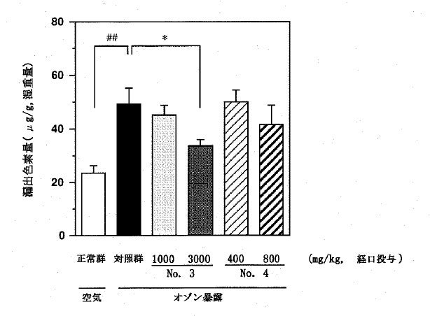 正常モルモット(オゾン非暴露群:注射用蒸留水投与群)の気管および主気管支における漏出色素量は23.5±3.0および23.4±3.1μgであった。これに対し、平均3ppmのオゾンガスを30分間暴露した対照群(オゾン暴露群:注射用蒸留水投与群)の気管及び主気管支における色素量は、それぞれ56.0±6.7および49.0±6.2μgと有意に増加し、血管透過性の亢進が認められた。