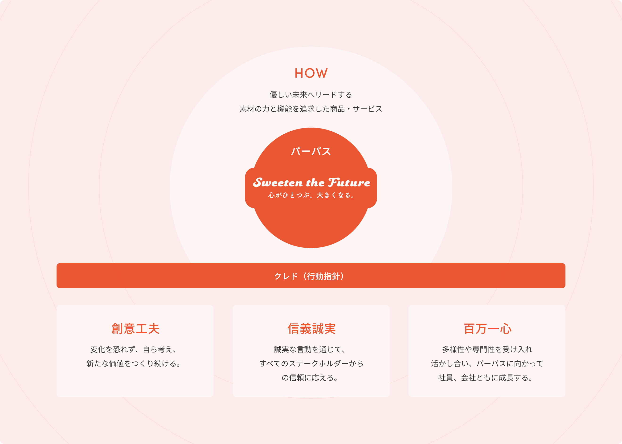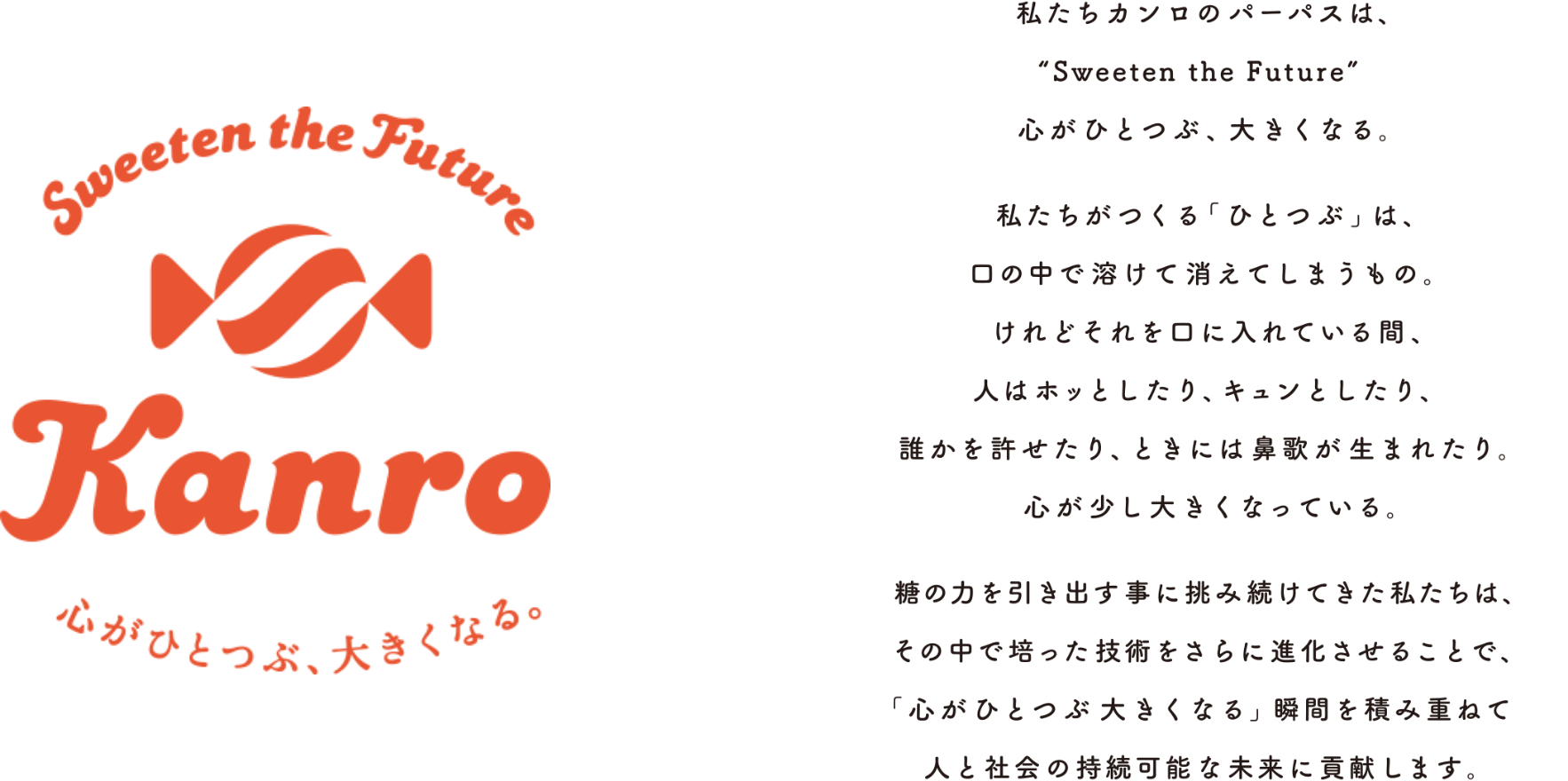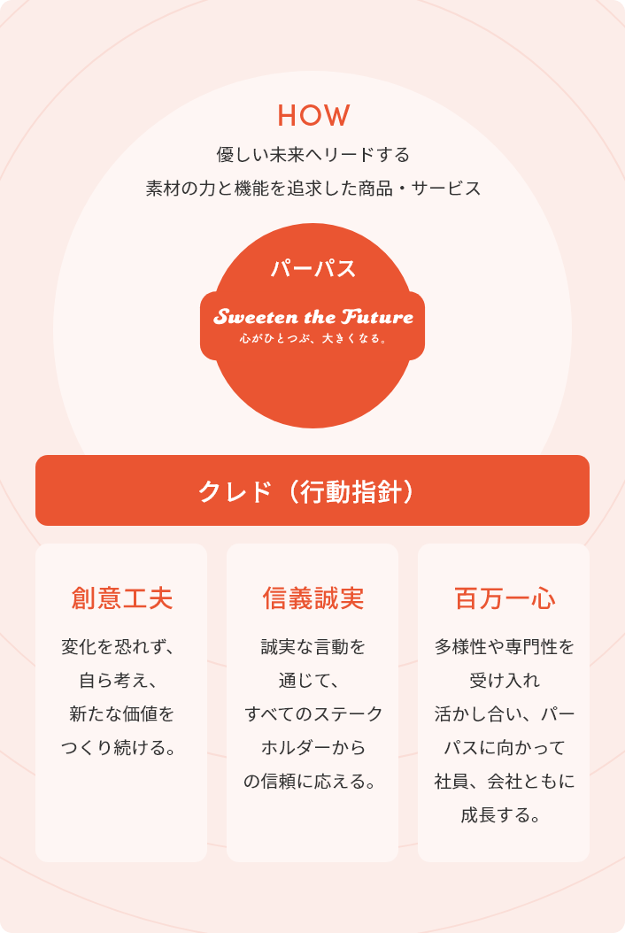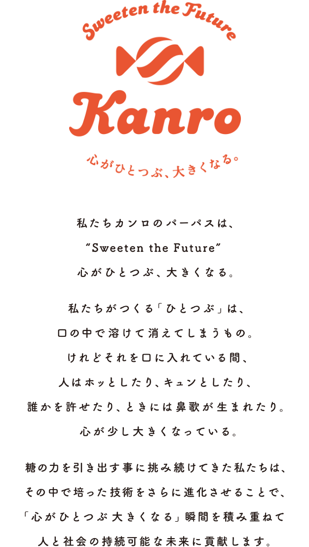 パーパスはカンロにおける全ての企業活動の起点です。一人一人が創意工夫、信義誠実、百万一心を実行しながら商品・サービスを提供することで、パーパスを実現していきます。