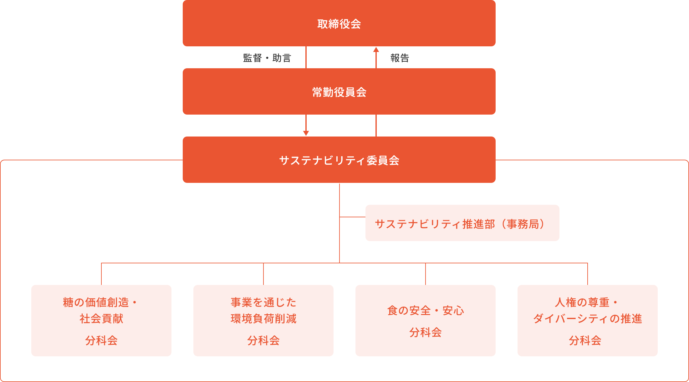 当社は、全社員がサステナビリティへの意識をより一層高め、これまでの取組みを深化させることを目的として、各部門より選出された委員から構成される組織横断の「サステナビリティ委員会」を2022年4月に新設しました。4つの分科会を束ねる当委員会に加え、2024年からはサステナビリティ推進部を新設し、活動基盤を強化しました。 当委員会で協議された内容は四半期に一回以上の頻度で常勤役員会・取締役会へ報告され、取締役会が監督・助言しています。中期経営計画や年度の予算等の重要事項を取締役会において決議される際に、当委員会からの報告内容が考慮されています。