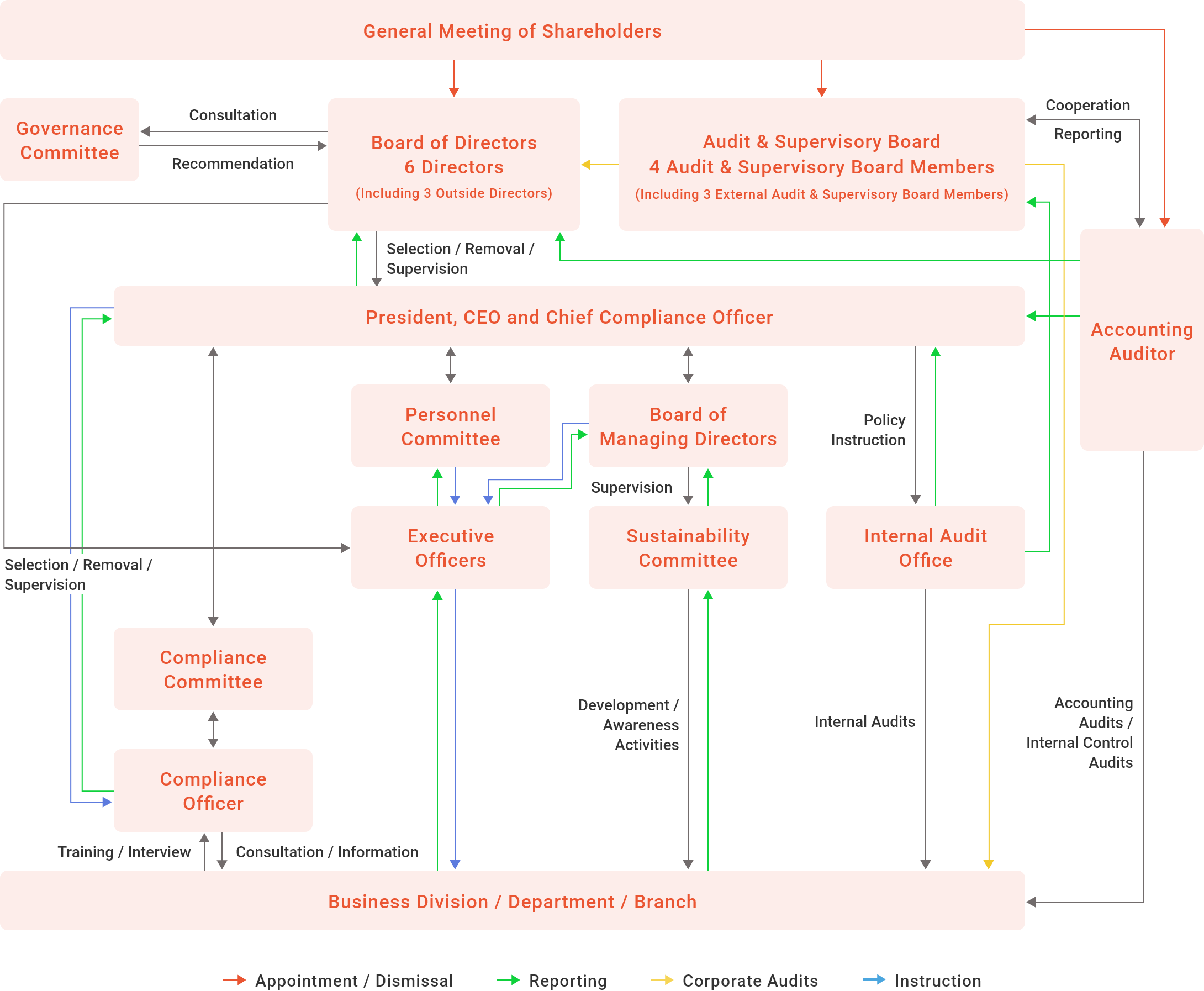 Kanro makes it a basic policy to ensure business transparency, guarantee sound management practice, and increase management efficiency. It works to enhance corporate governance by placing priority on strengthening the functions of its Board of Directors and Audit & Supervisory Board, strengthening functions to prevent illegal acts, disclosure, and being accountable to its shareholders. In order to realize this, Kanro has adopted the structure of a company with an Audit & Supervisory Board and maintains strong management oversight functions by electing Outside Directors and Outside Audit & Supervisory Board Members that satisfy the requirements for independent officers, in addition to introducing an Executive Officer system and working to accelerate and increase the efficiency of decision making and the execution of business.