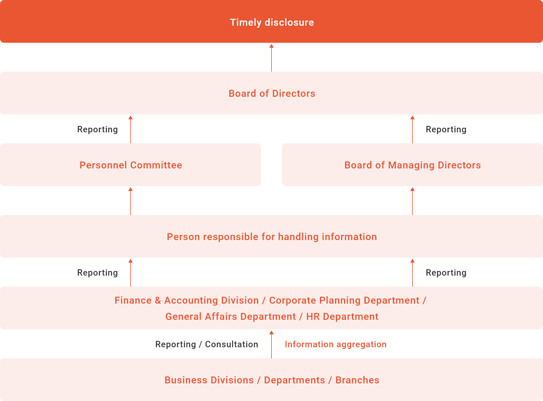 The Chief Financial Officer (CFO) is responsible for the handling of information, while the Finance & Accounting Division (Accounting Department) acts as our contact point for timely disclosure. We are constantly working to raise awareness of the importance of timely disclosure within the Kanro organization. We have also established a system that allows officers and employees to report to the Accounting Department immediately and seek advice about any events or decisions in the organizations to which they belong that are seen as likely to have a significant impact on decisions by investors. Decisions by the Board of Directors, Board of Managing Directors, and Personnel Committee are reported directly to the CFO. Information about events occurring in corporate headquarters, plants, or other offices is aggregated by the Corporate Planning Department, General Affairs Department, HR Department and Accounting Department and reported to the CFO. The CFO then determines whether timely disclosure is required and implements the necessary disclosure measures after consulting within the Company.