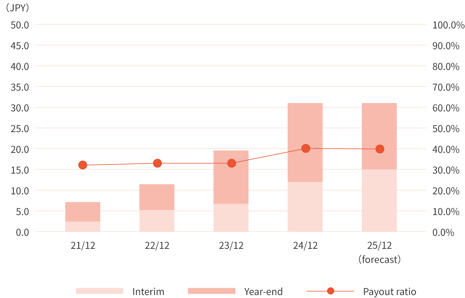 Returning profits to shareholders is an important policy, and under the “Medium-Term Corporate Strategy 2030” we have set a floor of 93 yen (31 yen after share split) per share, based on a 40% dividend payout ratio. Through growth in operating cash flow, the Company will achieve both investment in growth and stable dividends.