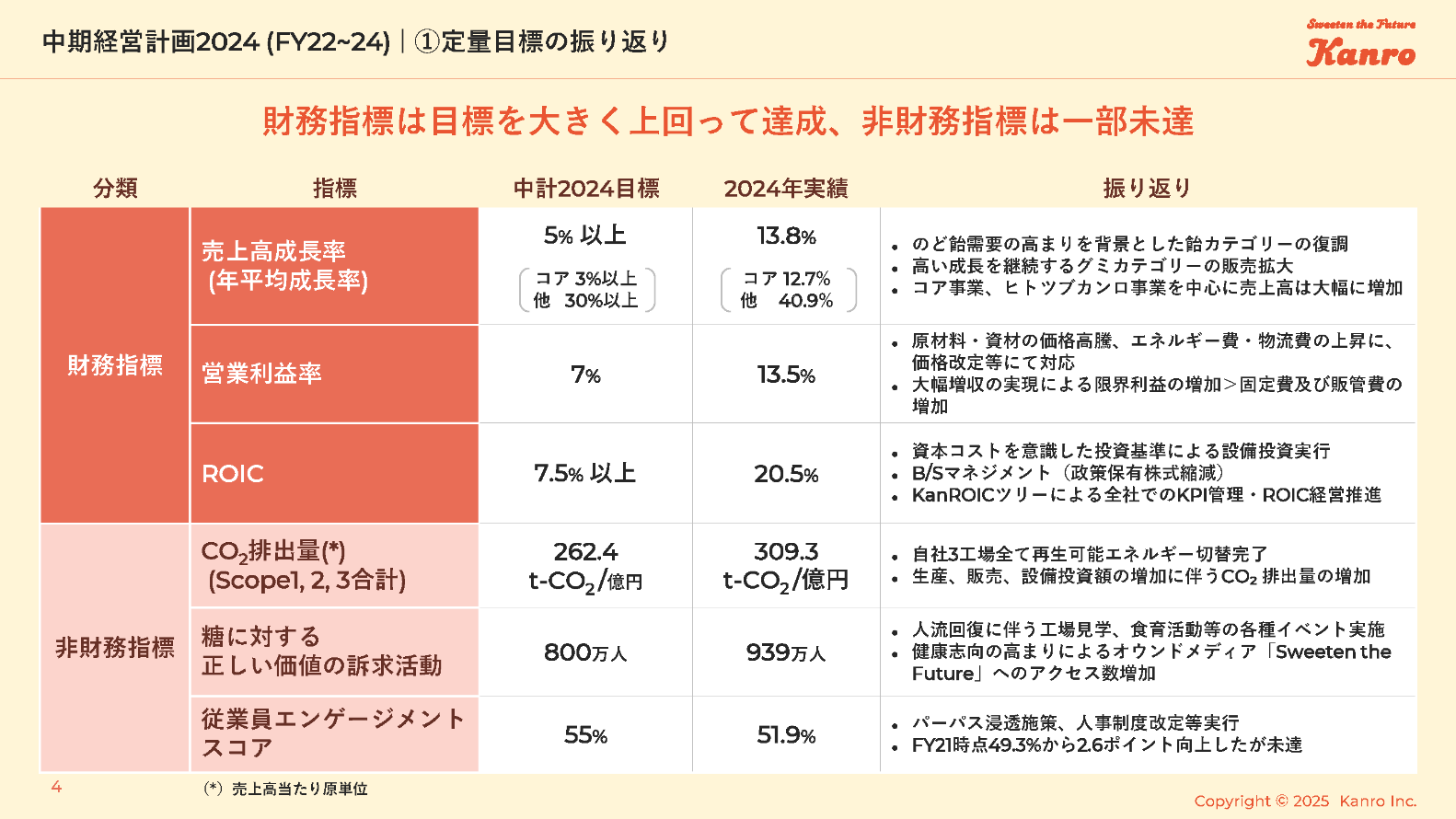財務指標は目標を大きく上回って達成、非財務指標は一部未達