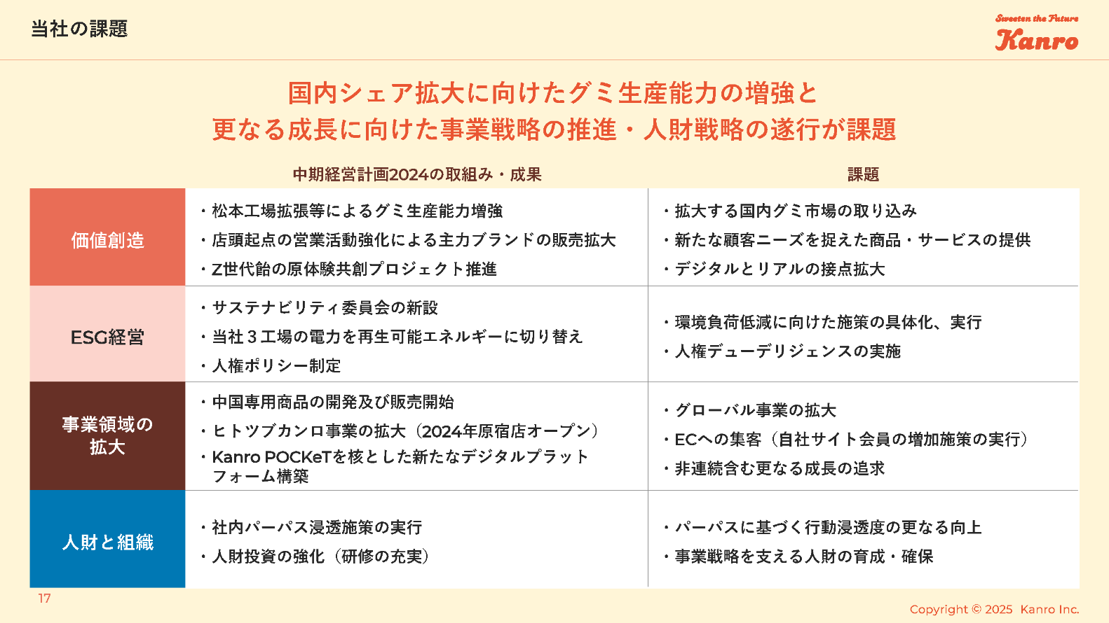 国内シェア拡大に向けたグミ生産能力の増強と更なる成長に向けた事業戦略の推進・人財戦略の遂行が課題