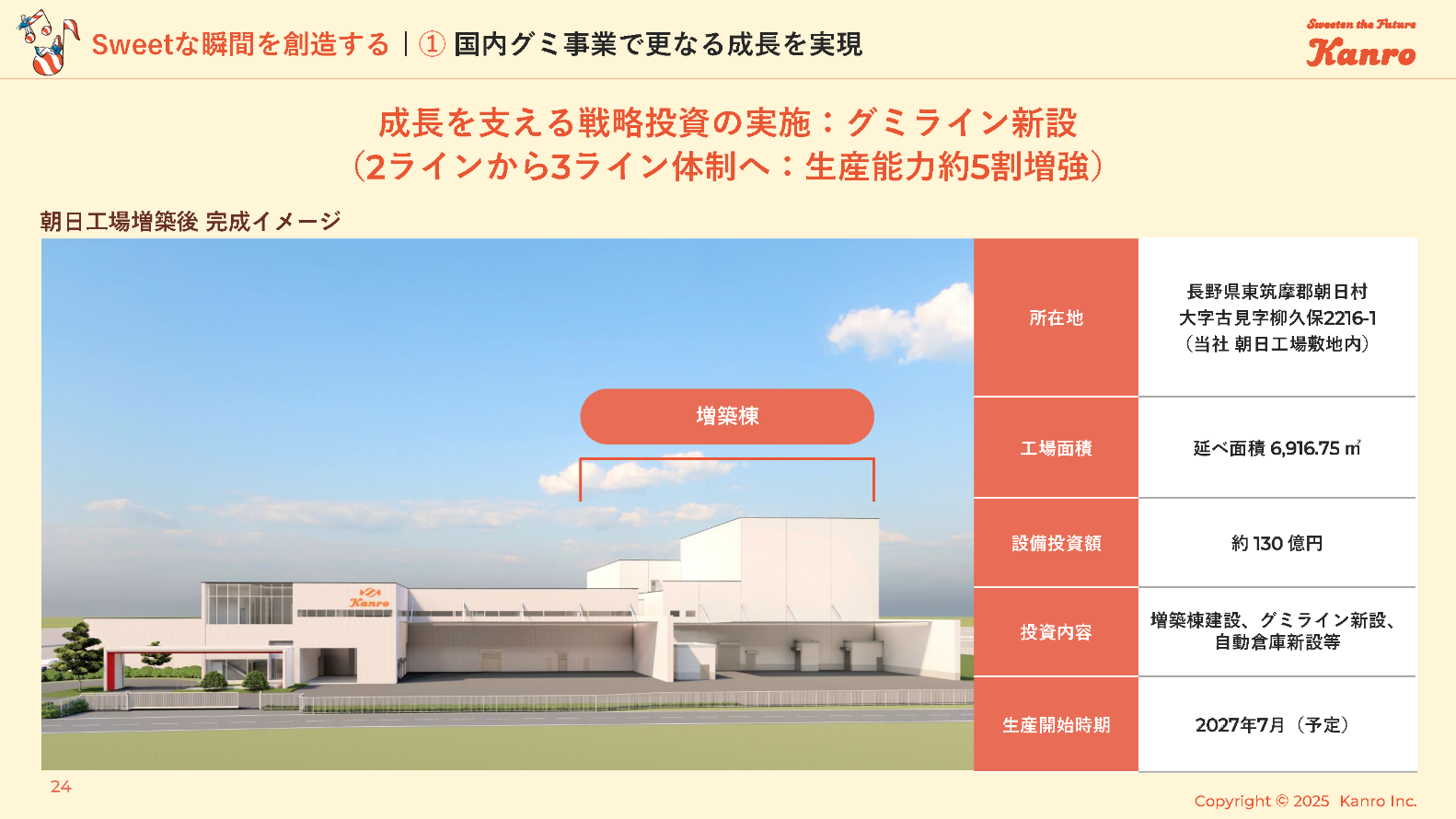 成長を支える戦略投資の実施:グミライン新設(2ラインから3ライン体制へ:生産能力約5割増強)
