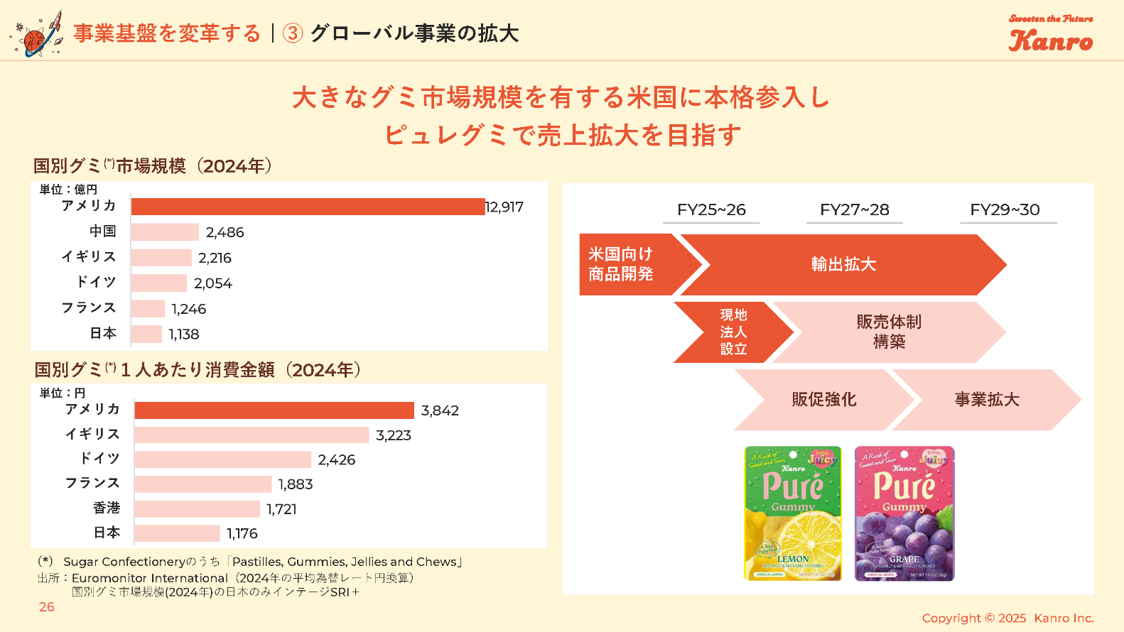 大きなグミ市場規模を有する米国に本格参入しピュレグミで売上拡大を目指す