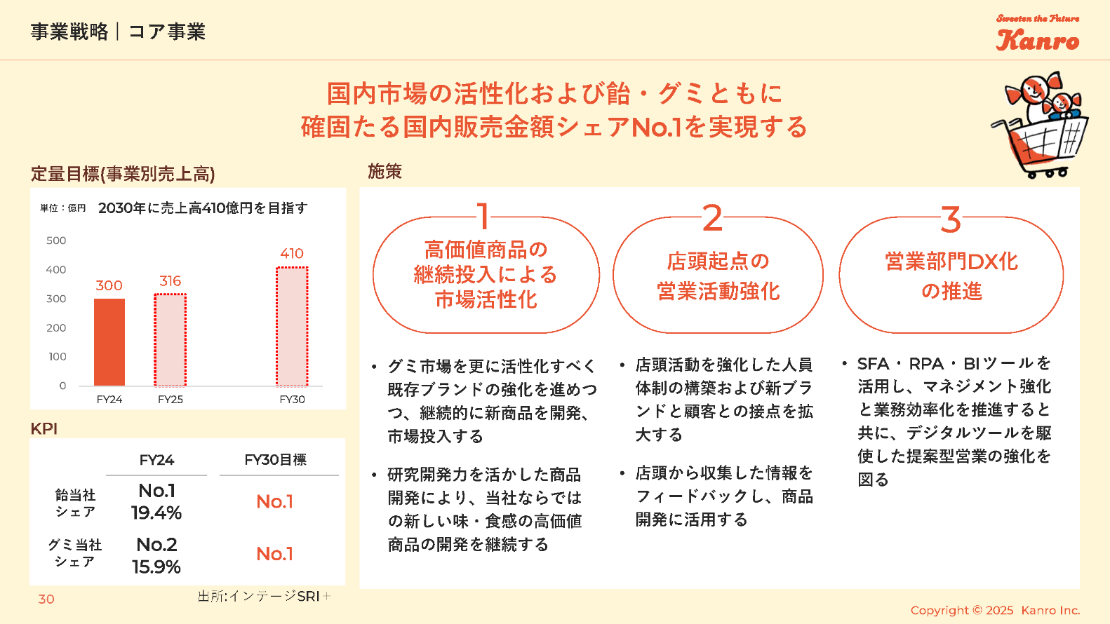 国内市場の活性化および飴・グミともに確固たる国内販売金額シェアNo.1を実現する