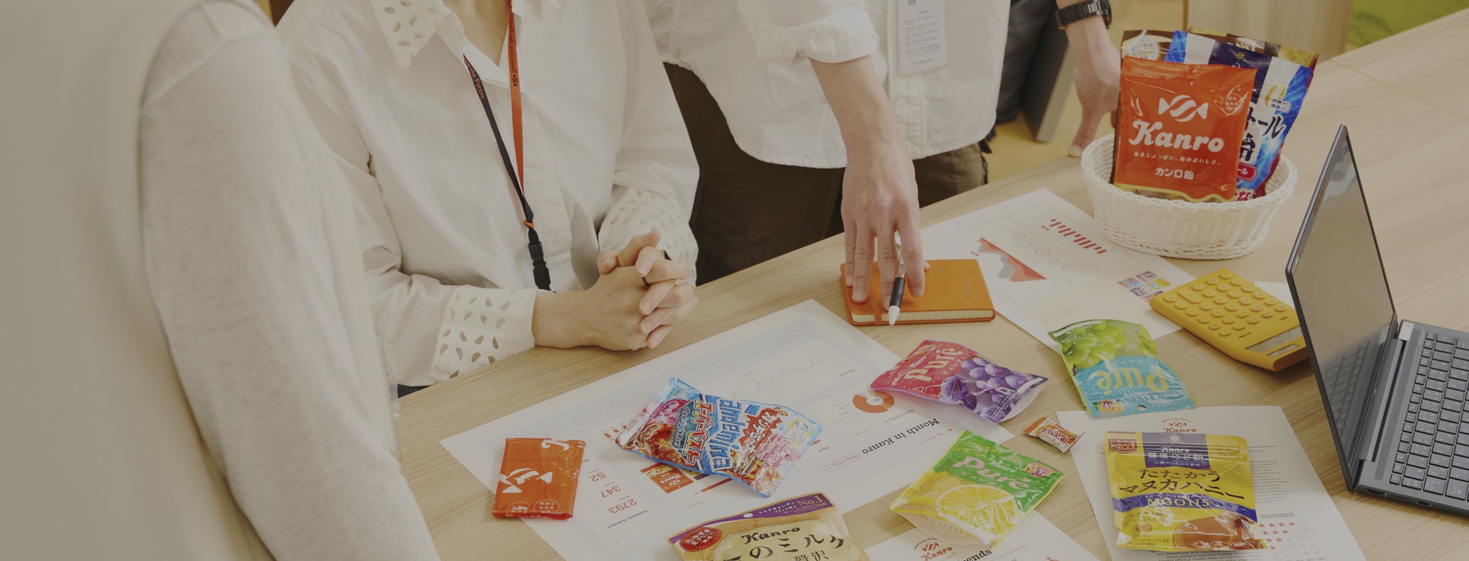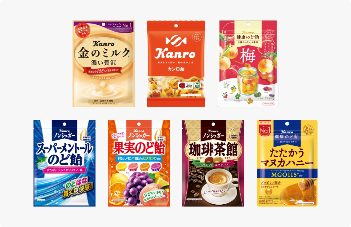 マーケティング部門とブランド開発部門が一体となり、「カンロ飴」「金のミルク」「健康のど飴」「ノンシュガー」「ピュレグミ」「カンデミーナ」といった既存主力ブランドの育成、強化を行っています。