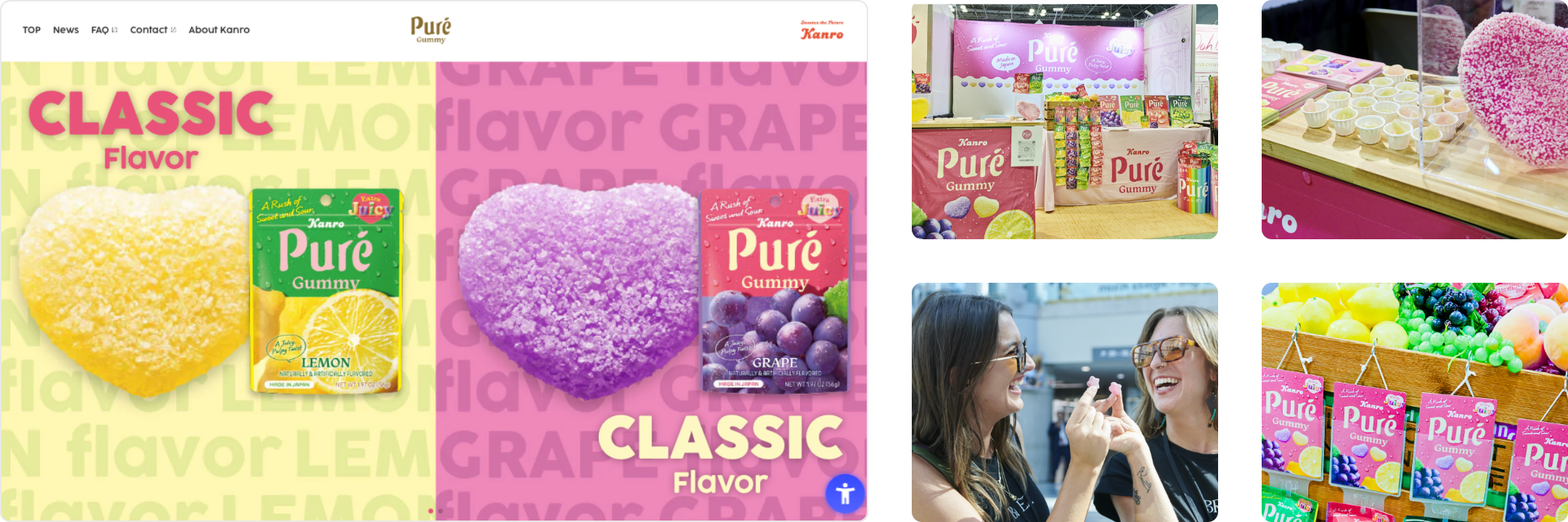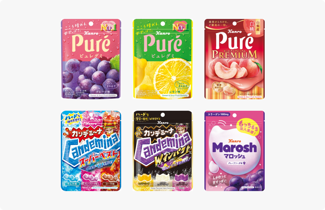 グミ市場ブランドランキング売上1位※の「ピュレグミ」は、カンロを代表する主力グミブランドです。また独特なハード食感が特徴のエンターテインメントグミ「カンデミーナ」や、エアレーション製法によるもちもち弾力食感の「マロッシュ」をはじめ、様々な商品を展開。味わいや食感、形の自由なグミの可能性を日々探求しています。