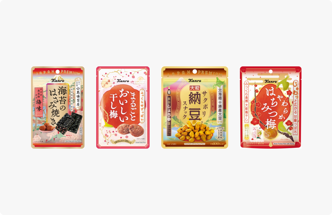 種ぬきで食べやすい「まるごとおいしい干し梅」、海苔の間に具材を挟んだ「海苔のはさみ焼き」、納豆をフリーズドライした「サクポリ納豆スナック」など、品質にこだわった素材菓子を提供しています。