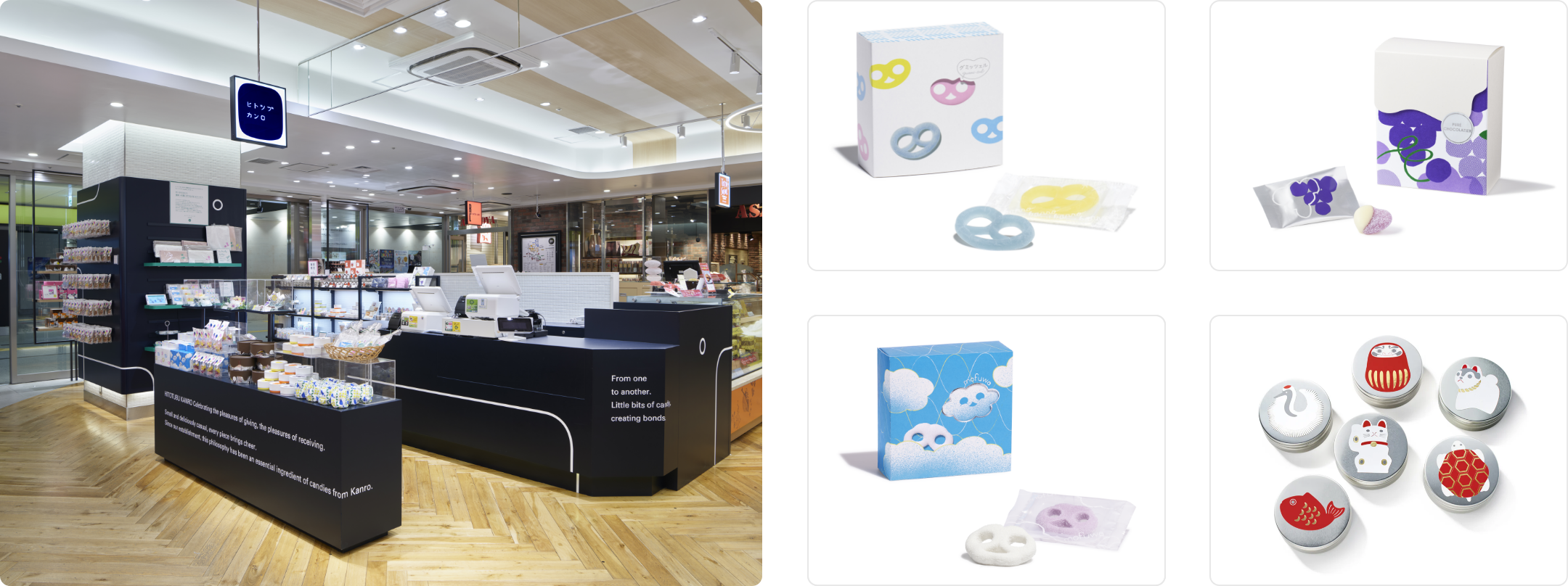 創業100周年を迎えた2012年にオープンした「ヒトツブカンロ」は、「ヒトからヒトへ つながるヒトツブ」をコンセプトに、キャンディの新たな魅力を広め、キャンディを贈りものとしてあげる楽しさと、もらう楽しさを提案する直営店です。
