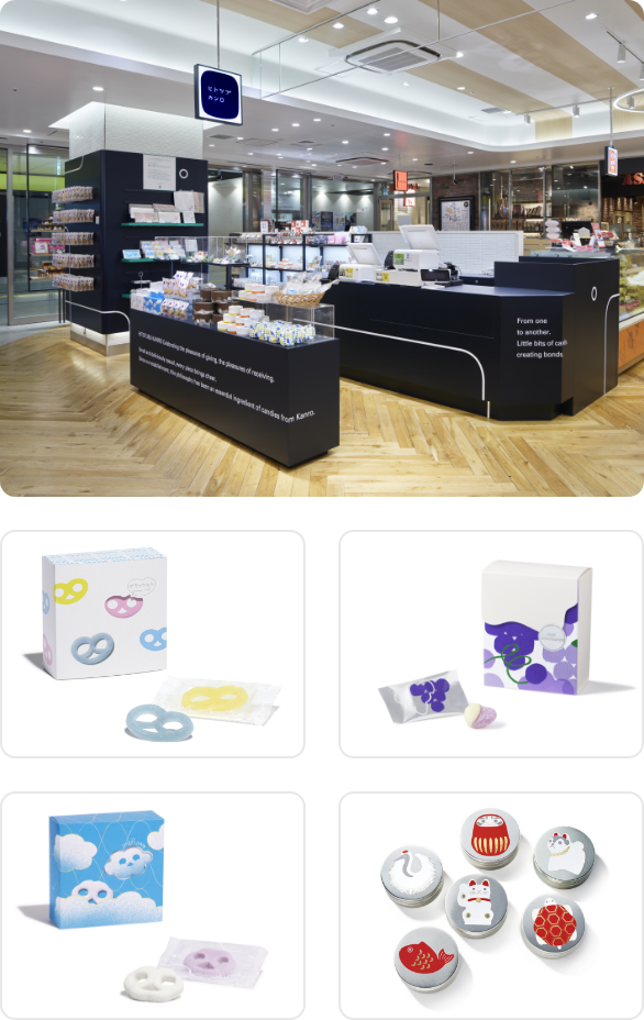 創業100周年を迎えた2012年にオープンした「ヒトツブカンロ」は、「ヒトからヒトへ つながるヒトツブ」をコンセプトに、キャンディの新たな魅力を広め、キャンディを贈りものとしてあげる楽しさと、もらう楽しさを提案する直営店です。